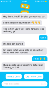 But help is at hand, in the form of a small, chatty robot. CBT (Cognitive behavioural therapy) is a really effective way to manage many mental illnesses by helping the sufferer to reframe their concerns, and build a slightly different perspective. What Woebot does is a friendly kind of “self-service CBT”.